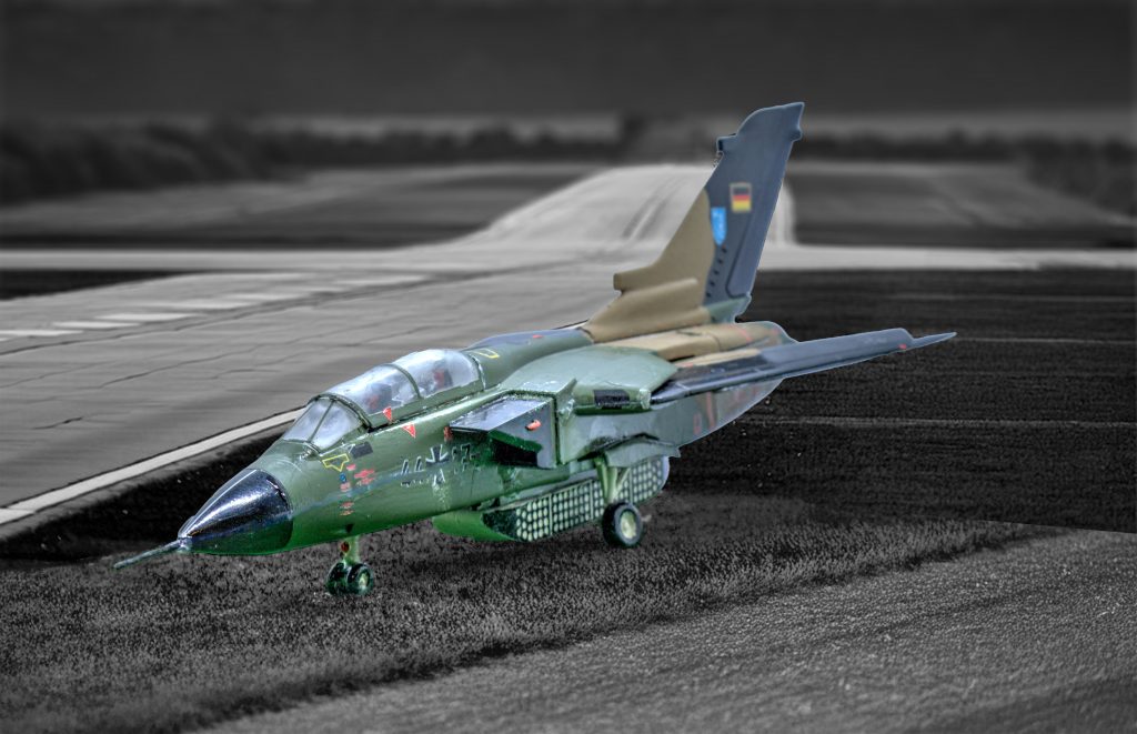 The Panavia Tornado is a family of twin-engine, variable-sweep wing multi-role combat aircraft, jointly developed and manufactured by Italy, the United Kingdom and Germany. There are three primary Tornado variants: the Tornado IDS (interdictor/strike) fighter-bomber, the Tornado ECR (electronic combat/reconnaissance) SEAD aircraft and the Tornado ADV (air defence variant) interceptor aircraft. It first flew on 14 August 1974 and was introduced into service in 1979–1980. Due to its multirole design, it was able to replace several different types of aircraft in the adopting air forces. The Royal Saudi Air Force (RSAF) became the only export operator of the Tornado, in addition to the three original partner nations. The Tornado was operated by the Royal Air Force (RAF), Italian Air Force, and RSAF during the Gulf War of 1991, in which the Tornado conducted many low altitude penetrating strike missions. The Tornados of various services were also used in the Bosnian War, Kosovo War, Iraq War, in Libya during the 2011 Libyan civil war, as well as smaller roles in Afghanistan, Yemen, and Syria. Including all variants, 990 aircraft were built. We celebrate this remarkable Aircraft with a scale model of a Panavia Tornado…