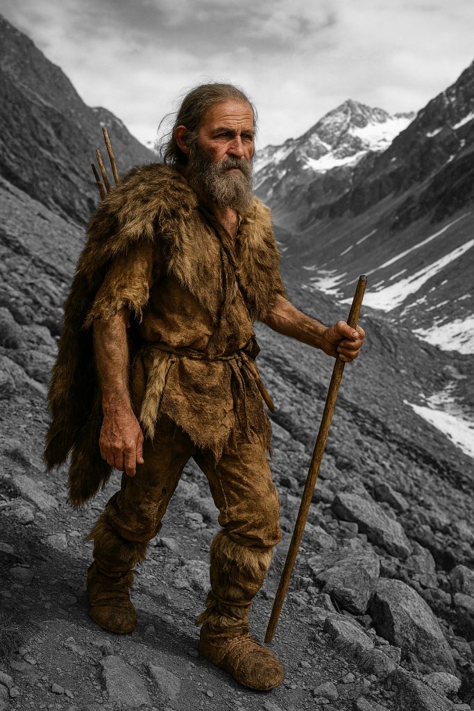 Ötzi, also called The Iceman, is the natural mummy of a man who lived between 3350 and 3105 BC. Ötzi’s remains were discovered on 19 September 1991, in the Ötztal Alps (hence the nickname „Ötzi) at the Austria–Italy border. He is Europe’s oldest known natural human mummy, offering an unprecedented view of Chalcolithic (Copper Age) Europeans. Because of the presence of an arrowhead embedded in his left shoulder and various other wounds, researchers believe that Ötzi was killed by another person. The nature of his life and the circumstances of his death are the subject of much investigation and speculation. His remains and personal belongings are on exhibit at the South Tyrol Museum of Archaeology in Bolzano, South Tyrol, Italy. Ötzi was found on 19 September 1991 by two German tourists, at an elevation of 3,210 m (10,530 ft) on the east ridge of the Fineilspitze in the Ötztal Alps on the Austrian Italian border, near Similaun mountain and the Tisenjoch pass. We celebrate this remarkable discovery with an AI image of Ötzi as he could have looked like…