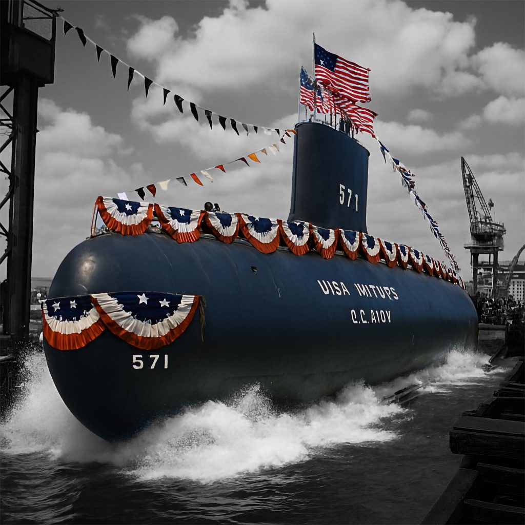 USS Nautilus (SSN-571) was the world’s first nuclear-powered boat, nuclear-powered submarine, and the first submarine to complete a submerged transit of the North Pole on 3 August 1958. Her initial commanding officer was Eugene „Dennis“ Wilkinson, a widely respected naval officer who set the stage for many of the protocols of today’s Nuclear Navy in the US, and who had a storied career during military service and afterwards. Nautilus shares the name of the fictional submarine in Jules Verne’s classic 1870 science fiction novel Twenty Thousand Leagues Under the Sea and the USS Nautilus (SS-168) that served with distinction in World War II. The Nautilus was authorized in 1951. Construction began in 1952, and it was launched in January 1954, sponsored by Mamie Eisenhower, wife of President Dwight D. Eisenhower. It was commissioned the following September into the United States Navy and was delivered to the Navy in 1955. We celebrate this feat of navigation with an AI Image of the Nautilus being watered …
