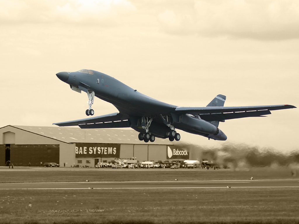 The Rockwell B-1 Lancer[b] is a supersonic variable-sweep wing, heavy bomber used by the United States Air Force. It has been nicknamed the „Bone“ (from „B-One“). As of 2024, it is one of the United States Air Force’s three strategic bombers, along with the B-2 Spirit and the B-52 Stratofortress. It is a heavy bomber with up to a 75,000-pound (34,000 kg) payload. The program was canceled in 1977 due to its high cost, the introduction of the AGM-86 cruise missile that flew the same basic speed and distance, and early work on the B-2 stealth bomber. The program was restarted in 1981, largely as an interim measure due to delays in the B-2 stealth bomber program. The B-1A design was altered, reducing top speed to Mach 1.25 at high altitude, increasing low-altitude speed to Mach 0.92, extensively improving electronic components, and upgrading the airframe to carry more fuel and weapons. Named the B-1B, deliveries of the new variant began in 1985; the plane formally entered service with Strategic Air Command (SAC) as a nuclear bomber the following year. By 1988, all 100 aircraft had been delivered. We celebrate this remarkable aircraft with an image of a Lancer taking off …
