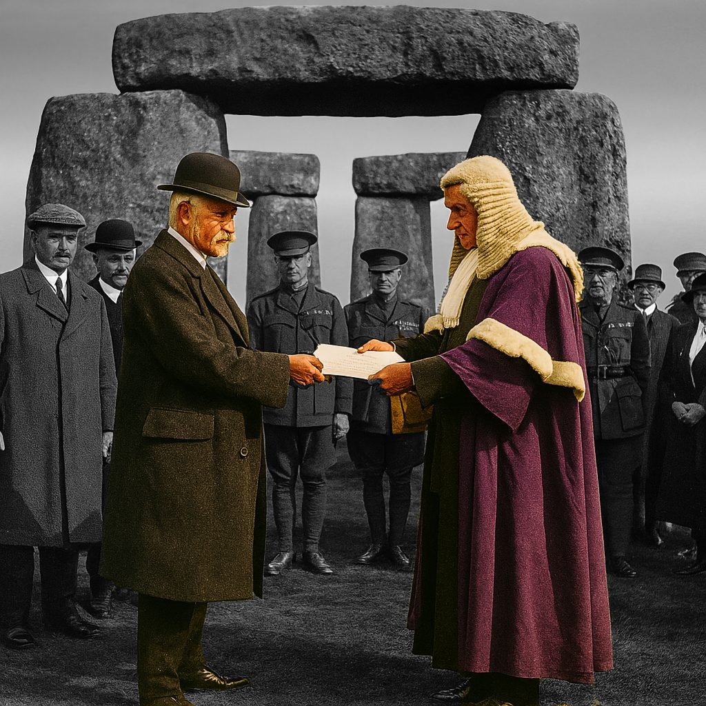 Stonehenge is a prehistoric megalithic structure on Salisbury Plain in Wiltshire, England, two miles (3 km) west of Amesbury. It consists of an outer ring of vertical sarsen standing stones, each around 13 feet (4.0 m) high, seven feet (2.1 m) wide, and weighing around 25 tons, topped by connecting horizontal lintel stones, held in place with mortise and tenon joints, a feature unique among contemporary monuments. Inside is a ring of smaller bluestones. Inside these are free-standing trilithons, two bulkier vertical sarsens joined by one lintel. The whole monument, now in ruins, is aligned towards the sunrise on the summer solstice and sunset on the winter solstice. The stones are set within earthworks in the middle of the densest complex of Neolithic and Bronze Age monuments in England, including several hundred tumuli (burial mounds). Stonehenge was constructed in several phases beginning about 3100 BC and continuing until about 1600 BC. One of the most famous landmarks in the United Kingdom, Stonehenge is regarded as a British cultural icon. Cecil Chubb bought the site for £6,600 (£668,000 in 2023) in 1915 and gave it to the nation three years later, with certain conditions attached. We celebrate this remarkable stone age site with an AI image of Chubb donating it to the nation …