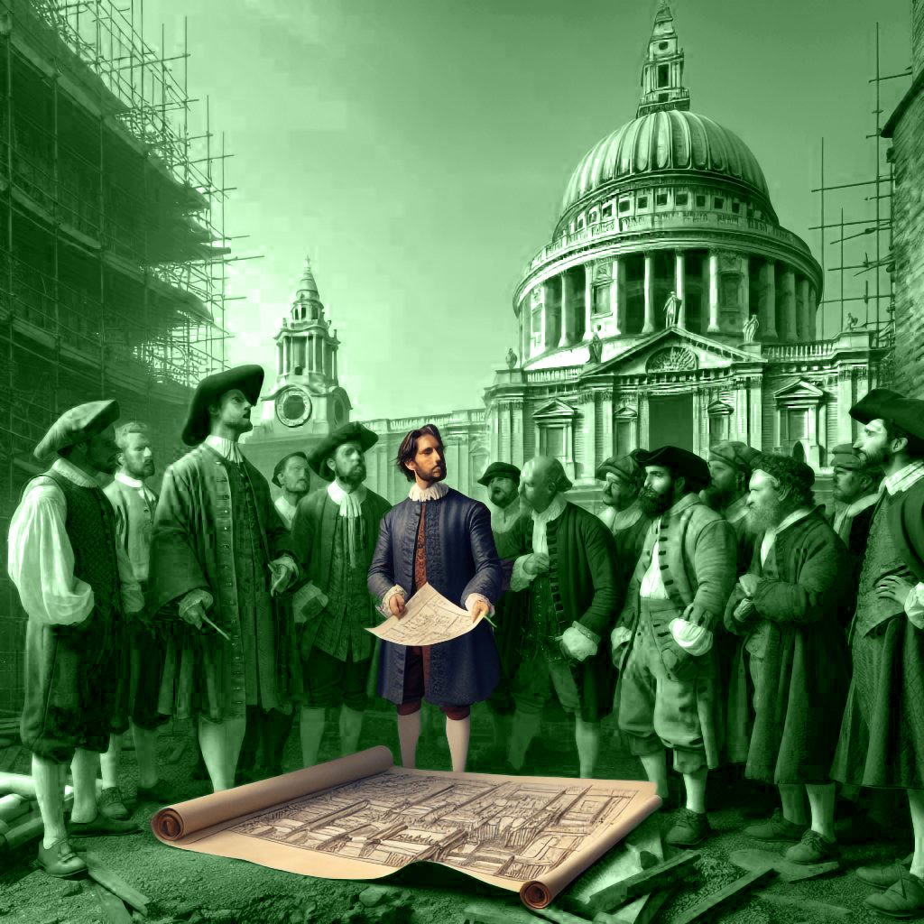 Sir Christopher Wren FRS (30 October 1632 – 8 March 1723) was an English architect, astronomer, mathematician and physicist who is one of the most highly acclaimed architects in the history of England. Known for his work in the English Baroque style, he was accorded responsibility for rebuilding 52 churches in the City of London after the Great Fire in 1666, including what is regarded as his masterpiece, St Paul’s Cathedral, on Ludgate Hill, completed in 1710. The principal creative responsibility for a number of the churches is now more commonly attributed to others in his office, especially Nicholas Hawksmoor. Other notable buildings by Wren include the Royal Hospital Chelsea, the Old Royal Naval College, Greenwich, and the south front of Hampton Court Palace. Educated in Latin and Aristotelian physics at the University of Oxford, Wren was a founder of the Royal Society and served as its president from 1680 to 1682. His scientific work was highly regarded by Isaac Newton and Blaise Pascal. We celebrate his birthday with an AI image of him explaining how to erect St. Pauls …