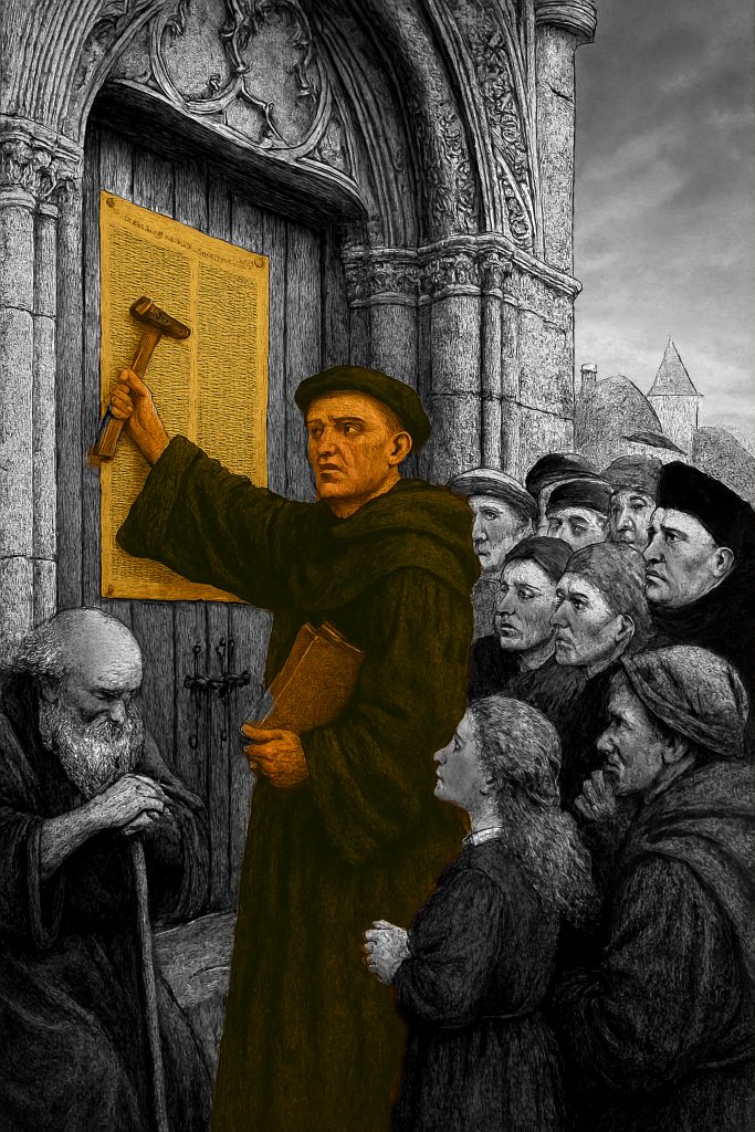 Martin Luther (10 November 1483 – 18 February 1546) was a German priest, theologian, author, hymn-writer, professor, and former Augustinian friar. Luther was the seminal figure of the Protestant Reformation, and his theological beliefs form the basis of Lutheranism. He is widely regarded as one of the most influential figures in Western and Christian history. Luther initiated an international debate on these in works like his Ninety-five Theses, which he authored in 1517. In 1520, Pope Leo X demanded that Luther renounce all of his writings, and when Luther refused to do so, excommunicated him in January 1521. Later that year, Holy Roman Emperor Charles V condemned Luther as an outlaw at the Diet of Worms. When Luther died in 1546, his excommunication by Leo X was still in effect. We celebrate this remarkable reformist with an AI image of him posting his 95 theses on a church door …