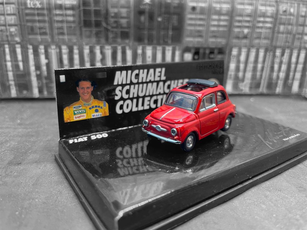Michael Schumacher (born 3 January 1969) is a German former racing driver who competed in Formula One from 1991 to 2006 and from 2010 to 2012. Schumacher won a record-setting seven Formula One World Drivers‘ Championship titles, tied by Lewis Hamilton in 2020, and—at the time of his retirement—held the records for most wins (91), pole positions (68), and podium finishes (155), while he maintains the record for most fastest laps (77), among others. Schumacher made his debut Formula One appearance with Jordan at the Belgian Grand Prix in 1991; his qualifying performance saw Benetton sign him for the remainder of the season. In 1992, he achieved his maiden victory in Belgium amongst several podiums, which he repeated at the Portuguese Grand Prix in 1993. Schumacher won his maiden World Drivers‘ Championship with eight victories in 1994, following a collision with his rival, Damon Hill, at the last race of the season. He won a further nine Grands Prix as he defended his title in 1995. We celebrate this remarkable racing drivers first championship with a scale model of his first car a FIAT 500 …