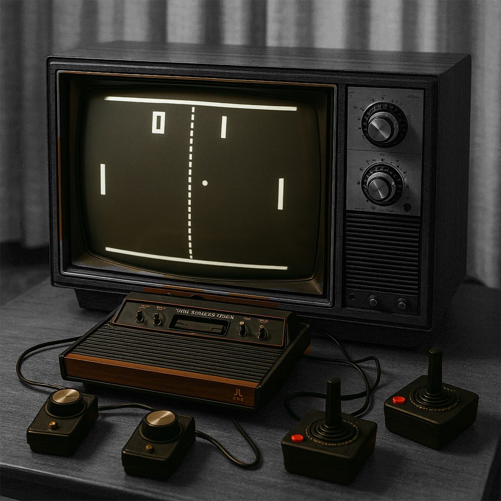 Pong is a 1972 sports video game developed and published by Atari, Inc. for arcades. It was created by Allan Alcorn as a training exercise assigned to him by Atari co-founder Nolan Bushnell. Bushnell and Atari co-founder Ted Dabney were so surprised by the quality of Alcorn’s work that they decided to manufacture the game. Bushnell based the game’s concept on an electronic ping-pong game included on the Magnavox Odyssey, the first home video game console; in response, Magnavox later sued Atari for patent infringement. Pong was the first commercially successful video game, helping to establish the video game industry along with the Magnavox Odyssey. Soon after its release, several companies began producing games that closely mimicked its gameplay. Eventually, Atari’s competitors released new types of video games that deviated from Pong’s original format to varying degrees; this, in turn, led Atari to encourage its staff to move beyond Pong and produce more innovative games themselves. We celebrate this great video game with an AI image of an Atari system …