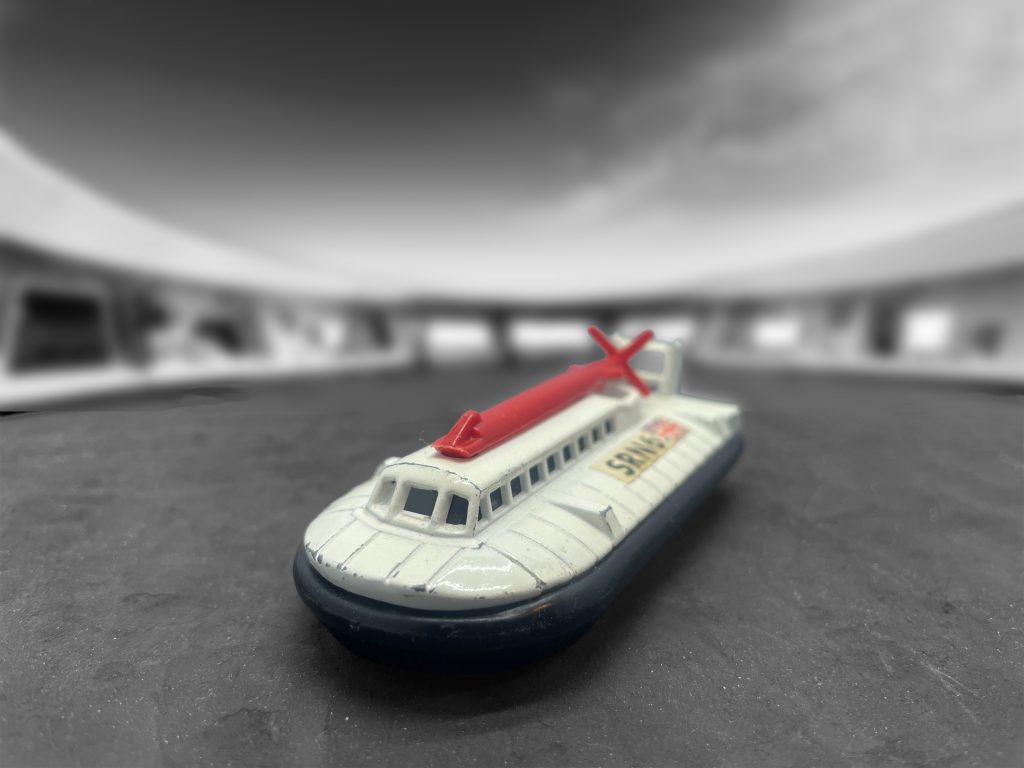 Cockerell’s theory was that instead of just pumping air under the craft, as Thornycroft had, if the air were to be instead channelled to form a narrow jet around the perimeter of the craft, the moving air would form a momentum curtain, a wall of moving air that would limit the amount of air that would leak out. This meant that the same cushion of high-pressure air could be maintained by a much smaller engine; and for the first time, a craft could be lifted completely out of the water. Cockrell tested his designs across the village green opposite his house in the Broadland village of Somerleyton in Suffolk. He tested his theories using a vacuum cleaner and two tin cans. His hypothesis was found to have potential, but the idea took some years to develop, and he was forced to sell personal possessions to finance his research. By 1955, he had built a working model from balsa wood and had filed his first patent for the hovercraft, No. GB 854211. Cockerell had found it impossible to interest the private sector in developing his idea, as both the aircraft and the shipbuilding industries saw it as lying outside their core business. He therefore approached the British Government with a view to interesting them in possible defence applications. We celebrate his invention with a scale model of the S.R.N.6 hovercraft …