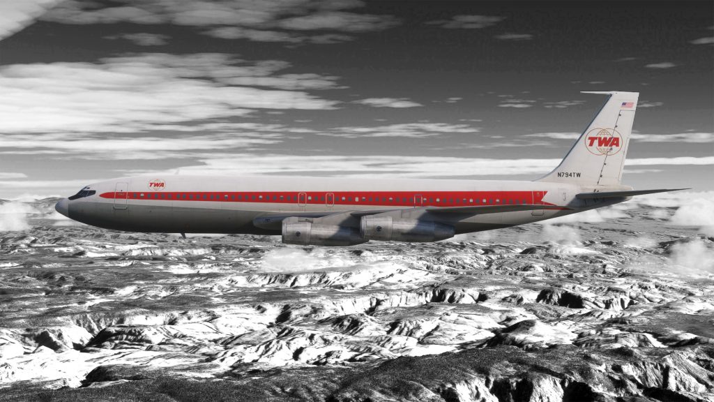 The Boeing 707 is an early American long-range narrow-body airliner, the first jetliner developed and produced by Boeing Commercial Airplanes. Developed from the Boeing 367-80 prototype, the initial 707-120 first flew on December 20, 1957. Pan Am began regular 707 service on October 26, 1958. With versions produced until 1979, the 707 is a swept wing quad-jet with podded engines. Its larger fuselage cross-section allowed six-abreast economy seating, retained in the later 720, 727, 737, and 757 models. Although it was not the first commercial jetliner in service, the 707 was the first to be widespread, and is often credited with beginning the Jet Age. It dominated passenger air-transport in the 1960s, and remained common through the 1970s, on domestic, transcontinental, and transatlantic flights, as well as cargo and military applications. It established Boeing as a dominant airliner manufacturer with its 7×7 series. The initial, 145-foot-long (44 m) 707-120 was powered by Pratt & Whitney JT3C turbojet engines. The shortened, long-range 707-138 and the more powerful 707-220 entered service in 1959. The longer-range, heavier 707-300/400 series has larger wings and is stretched slightly by 8 feet (2.4 m). Powered by Pratt & Whitney JT4A turbojets, the 707-320 entered service in 1959, and the 707-420 with Rolls-Royce Conway turbofans in 1960. We celebrate this remarkable aircraft with a picture of itself…