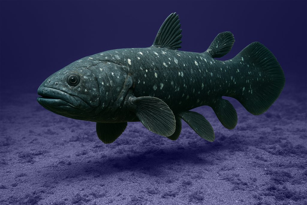 Coelacanths are an ancient group of lobe-finned fish (Sarcopterygii) in the class Actinistia. As sarcopterygians, they are more closely related to lungfish and tetrapods (the terrestrial vertebrates including living amphibians, reptiles, birds and mammals) than to ray-finned fish. The name coelacanth originates from the Permian genus Coelacanthus, which was the first scientifically named genus of coelacanths (in 1839), becoming the type genus of Coelacanthiformes as other species were discovered and named. Well-represented in freshwater and marine deposits from as early as the Devonian period (more than 410 million years ago), they were thought to have become extinct in the Late Cretaceous, around 66 million years ago. On the 17th January 1987 Munich biology student Olaf Reinicke was the first to discover a coelacanth in its natural habitat at a depth of 198 meters. We celebrate this day with an AI image of a Coelacanth…