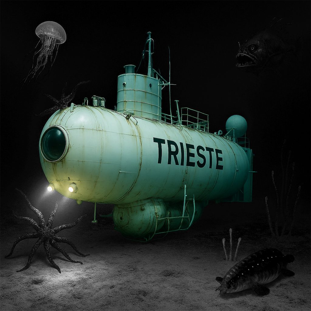 Trieste is a Swiss-designed, Italian-built deep-diving research bathyscaphe. In 1960, it became the first crewed vessel to reach the bottom of Challenger Deep in the Mariana Trench, the deepest point in Earth’s seabed. The mission was the final goal for Project Nekton, a series of dives conducted by the United States Navy in the Pacific Ocean near Guam. The vessel was piloted by Swiss oceanographer Jacques Piccard and US Navy lieutenant Don Walsh. They reached a depth of about 10,916 metres (35,814 ft) on the 23rd January 1960. The bathyscaphe was designed by Swiss scientist Auguste Piccard, the father of pilot Jacques Piccard. It was build at the Navalmeccanica in Castellammare di Stabia/Italy and launched on 1 August 1953. The vessel was first owned and operated by Auguste Piccard until it was purchased by the Office of Naval Research in 1958 for US$267,000. This would be equivalent to $2.9 million in 2024. Subsequently the vehicle was turned over to the Bureau of Ships’ Naval Electronics Laboratory at San Diego. It was taken out of service in 1966. Since the 1980s, it has been on exhibit in the National Museum of the United States Navy in Washington, D.C.. We celebrate this remarkable feat with a AI generated image of the Trieste …