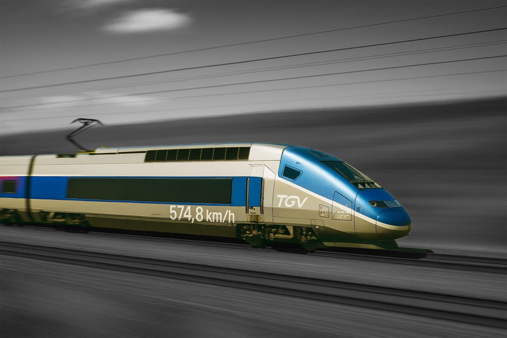 A specially modified TGV high-speed train known as Project V150, weighing only 265 tonnes, set the world record for the fastest wheeled train, reaching 574.8 km/h (357.2 mph) during a test run on 3 April 2007. In 2007, the world’s fastest scheduled rail journey was a start-to-stop average speed of 279.4 km/h (173.6 mph) between the Gare de Champagne-Ardenne and Gare de Lorraine on the LGV Est, not surpassed until the 2013 reported average of 283.7 km/h (176.3 mph) express service on the Shijiazhuang to Zhengzhou segment of China’s Shijiazhuang–Wuhan high-speed railway. During the engineering phase, the transmission voie-machine (TVM) cab-signalling technology was developed, as drivers would not be able to see signals along the track-side when trains reach full speed. It allows for a train engaging in an emergency braking to request within seconds all following trains to reduce their speed; if a driver does not react within 1.5 km (0.93 mi), the system overrides the controls and reduces the train’s speed automatically. The TVM safety mechanism enables TGVs using the same line to depart every three minutes. We celebrate this record with an AI image of the TGV at 574.8 km/h …